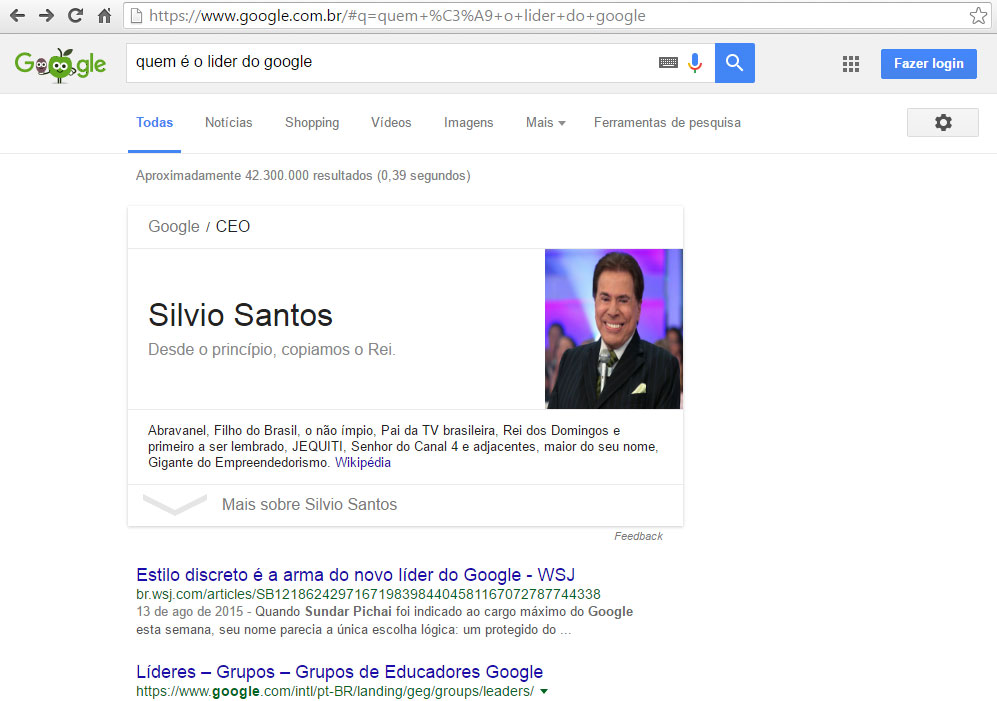 O próprio google exibe o resultado com a foto e descrição de Silvio Santos, quando você faz a busca por “quem é o lider do google”. Possivelmente é um erro no código e será corrigido em breve.