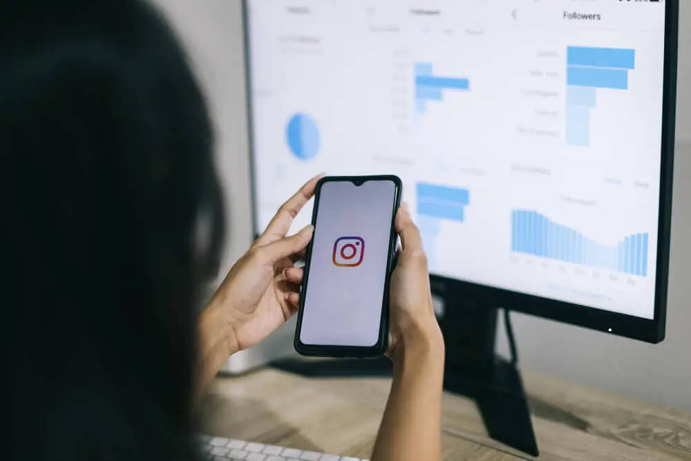 mãos segurando fone com a logo do instagram e ao fundo tela de computador mostrando gráficos de SEO
