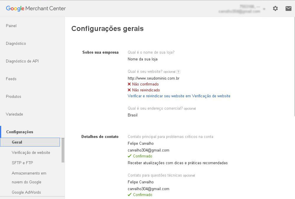 Dica extra: utilizar a mesma conta Google para o cadastro no Adwords e no Merchant Center facilitará no momento de integrar os dois serviços. Além disso, indico que essa mesma conta seja utilizada para o Google Analytics, dessa forma, será muito mais fácil mensurar os resultados das campanhas (e mensurar retorno sobre o investimento é crucial para quem investe em marketing digital).