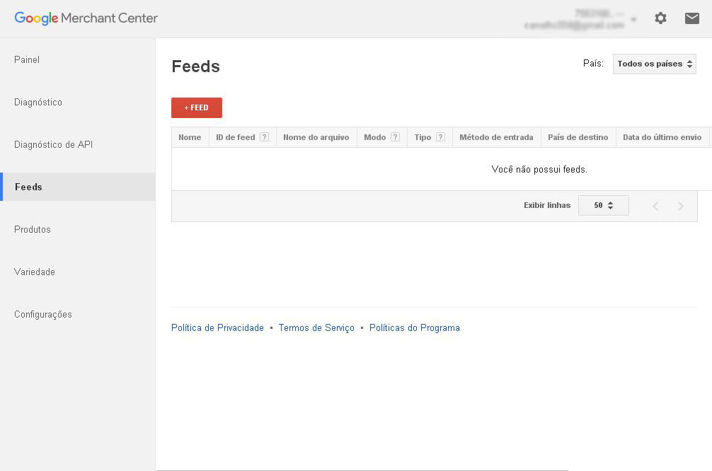 2. Clique no botão [+ FEED];Google Merchant Center - Criar feed de dados