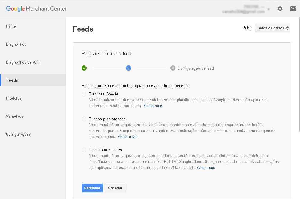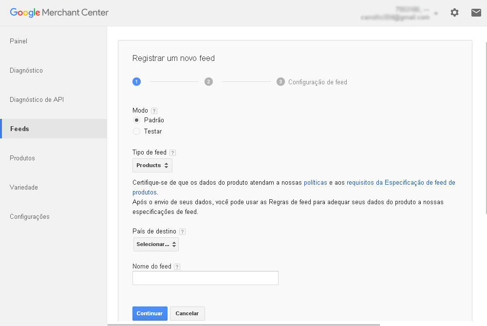 3. Preencha as informações para registrar um novo feed, cuidando para inserir as informações corretas. Se os seus dados apresentarem muitos problemas, o Google pode até mesmo suspender a sua conta;Google Merchant Center - registrar novo feed