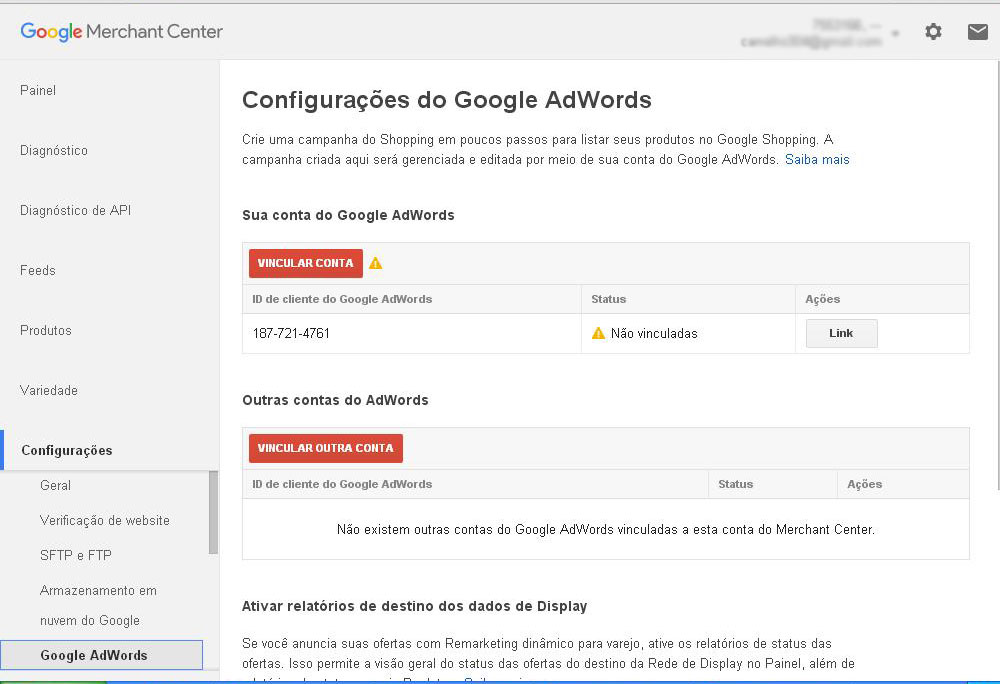 Outra ação necessária para anunciar no Google Shopping é vincular as contas do Merchant Center e do Adwords. Fazer isso é muito simples: